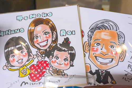 プロの有名似顔絵師による組数限定イベント。中学生以下のお子様とそのご家族の方の似顔絵をプレゼント。
