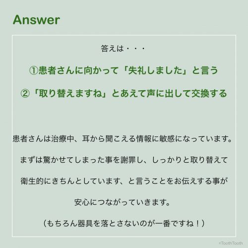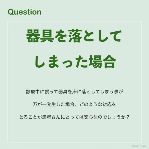 診療中に誤って器具を床に落としてしまう事が万が一発生した場合、どのような対応をとることが患者さんにとっては安心なのでしょうか?