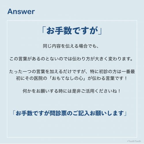 たった一つの言葉を加えるだけですが、特に初診の方は一番最初にその医院の「おもてなしの心」が伝わる言葉です!
